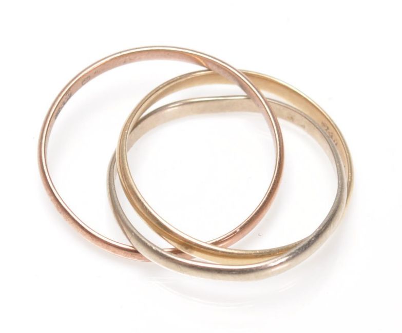 A 9ct gold hallmarked tri-colour puzzle ring. Hallmarked. Total weight 1.8g / Size I.5.