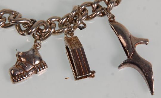 A silver charm bracelet having a heart padlock clasp. Adorned with various charms to include a high heel shoe, weighing scales, coin, boot, out house, cross and riding stirrup. Total weight 47.8g. Measures 6 inches long.