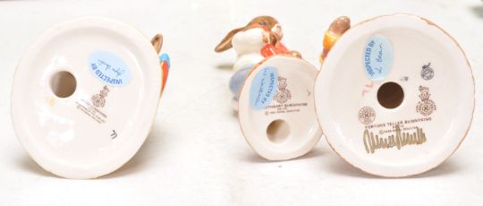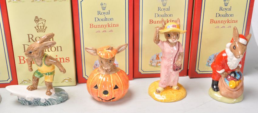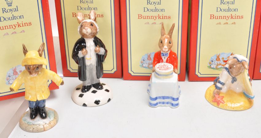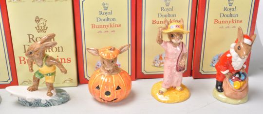 A group of twelve Royal Doulton Bunnykins ceramic figurines to include Rainy Day DB 147, Lawyer Bunnykins DB 214 (signed), Happy Birthday DB 21, Tailor DB 166, Sweetheart DB 130, Fortune Teller DB 218 (Signed), Billie & Buntie "Sleigh Ride" DB 4, Sundial DB 213 (Signed), Aussie Surfer DB 133, Halloween DB 132, Sightseer DB 215 (Signed) and Santa "Happy Christmas" DB 17. All boxed.
