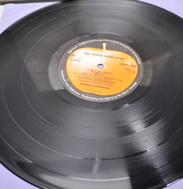 A three vinyl long play LP record album box set by George Harrison – All Things Must Pass – Original Apple Jam 1st U.K. Press – STCH 639 Stereo. Each vinyl in VG - E condition. Sleeve Condition G. With poster.