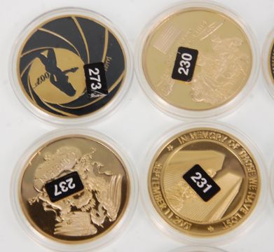 A mixed group of twelve plated coin medallions to include 4x Remember Sept 11 coins, 2x Bitcoin coins, 2018 Year of the Dog Five Dollar, Queen, 007 James Bond enamelled, Concorde 2003 and a 2016 Brexit coin.