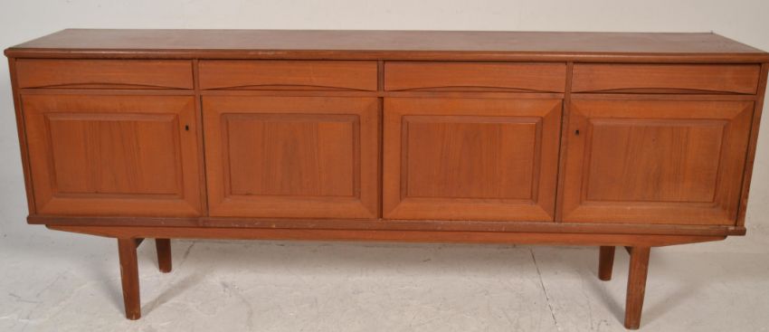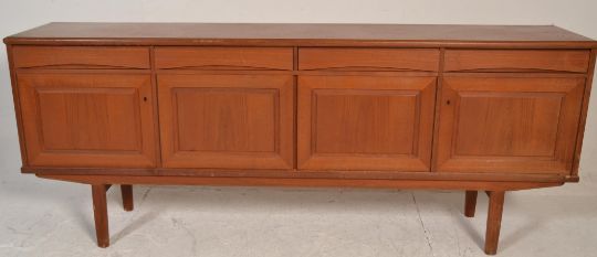 A mid century Scandinavian / Danish design teak wood sideboard credenza being raised on square tapering legs with a series of short drawers over cupboards beneath. Measures 81 cm high x 203 cm wide x 44 cm deep.