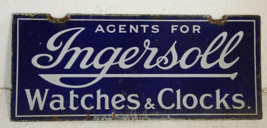 A vintage retro enamelled double sided advertising sign for Ingersoll Watches and Clocks having a blue ground with white lettering.