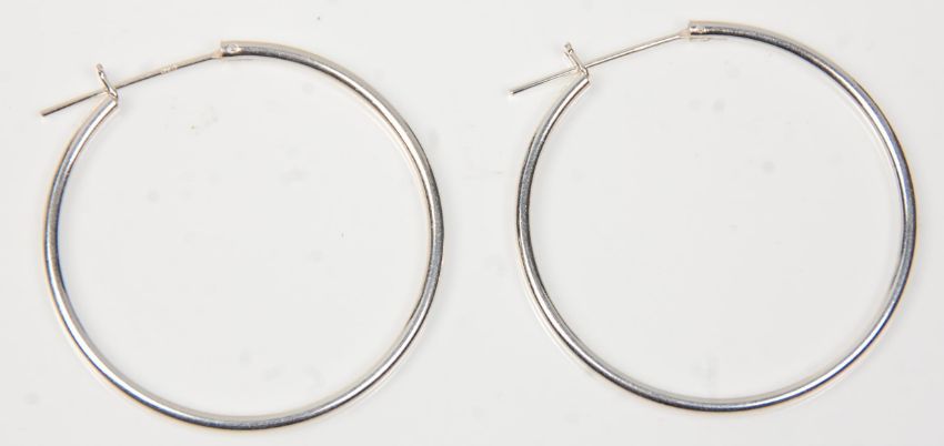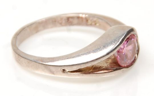 A pair of stamped 925 silver hoop earrings together with a silver cross over design ring set with a round cut pink stone. Weight 9.2g. Ring size S.5. Earrings measure 4 cm diameter.