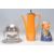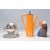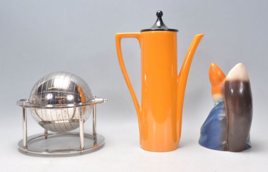 A vintage retro 20th Century Portmeirion coffee pot having an orange body with angular handle and black lid, together with a retro novelty Basil Brush money box and a steel desktop world globe having engraved details set within a gimbal raised on a round base.