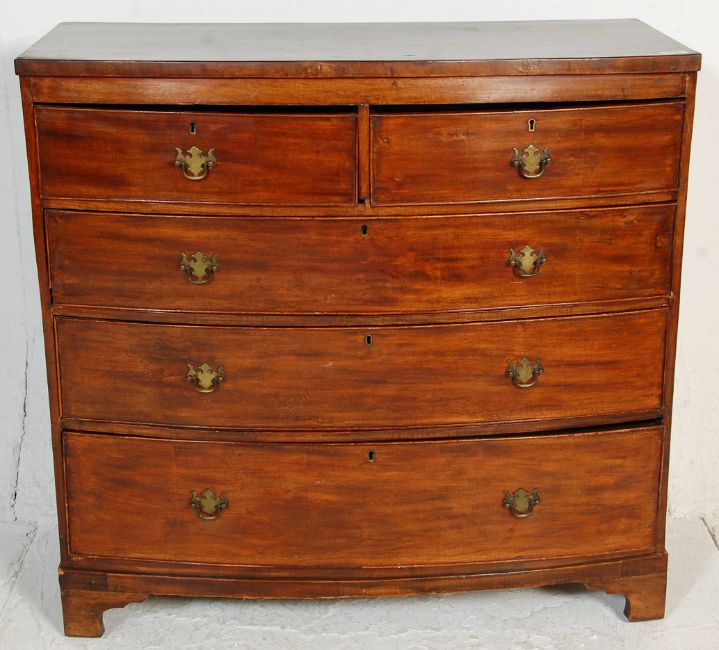 An late 19th Century Victorian mahogany antique bow front chest of drawers having two over three drawers with brass swing handles with locks to the top drawers.H91 W96 D48cm.