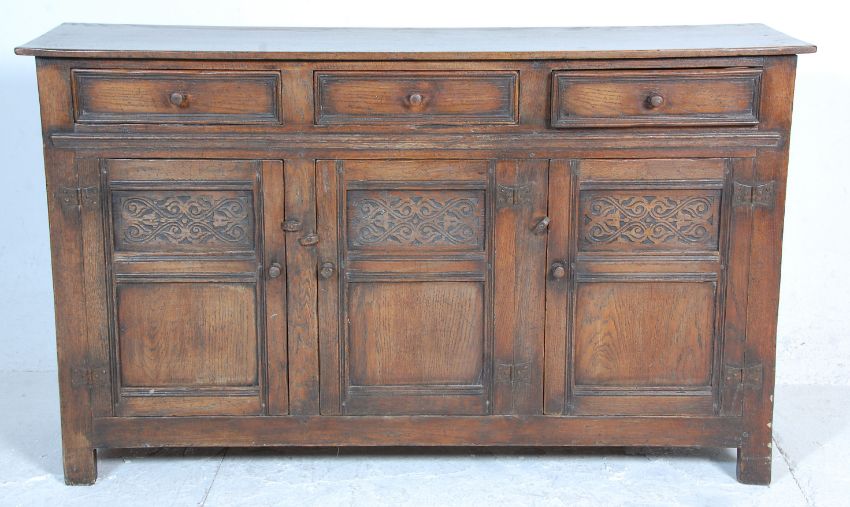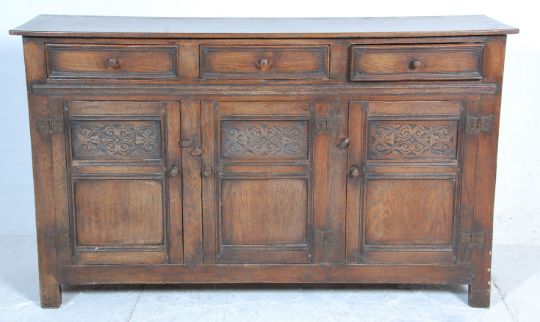 A good quality 20th century Ipswitch oak dresser base sideboard having three drawers with knob handles above a twin door cupboard with carved detail panels with one further cupboard to the right side. H92 W154 D53cm