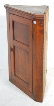 A 19th Century George III golden oak hanging corner cabinet having a panelled design door with a brass scutcheon to the door, opening to reveal three shelves within.