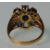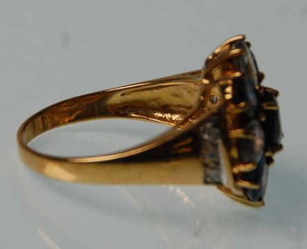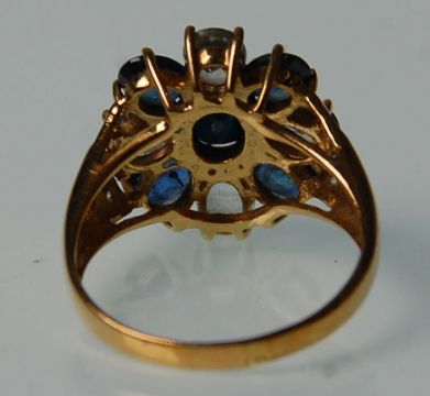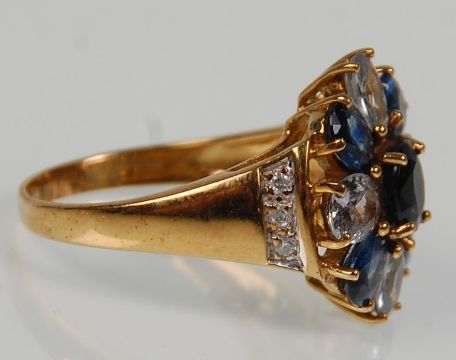 A hallmarked 9ct yellow gold ladies dress ring having various coloured oval faceted cut blue stones in a flower head mound with white accent stones to the shoulders. Hallmarked for Birmingham date letter G 2006. Gross weight 4.4. Ring size P.5 - Q.