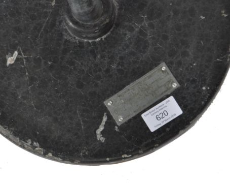 Famed - A mid 20th Century retro vintage industrial medical operating theatre lamp having a large brushed metal domed shade attached to a multi adjustable pivot raised on a telescopic upright on a round base. Applied plaque to base. Measures; 140cm x 45cm x 45cm.