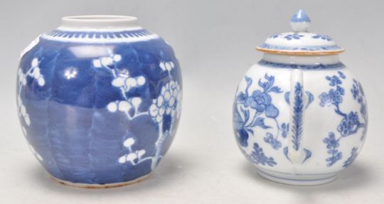 A 19th Century Chinese blue and white tea pot decorated with hand painted precious objects together with a prunus pattern ginger jar with concentric circle Kangxi marks to the base. Measures 13cm tall.