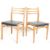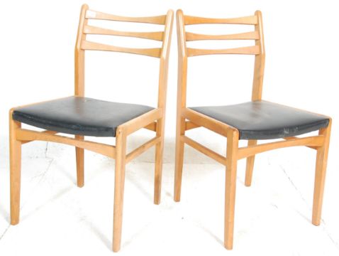 A set of six vintage retro mid 20th Century dining chairs being wooden framed with three horizontal bar supports to the back rest, with black leather upholstered seats raised on square supports. H81 W45 D45cm