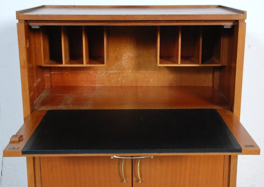 A mid century retro teak wood Danish inspired bureau desk. Raised on tapering legs with a double door cupboard beneath fall front bureau top having appointed interior set within.