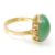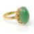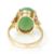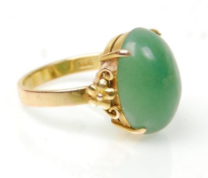 A stamped 14ct gold ring set with a round domed green jade cabochon with decorative floral design shoulders. Weight 4.8g.