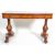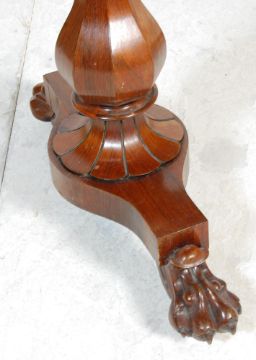 An early 19th Century rosewood writing table / desk having a rectangular top with twin drawers having two turned knob handles to each, raised on two column supports with faceted edges having stretcher bases terminating in lion paw feet.