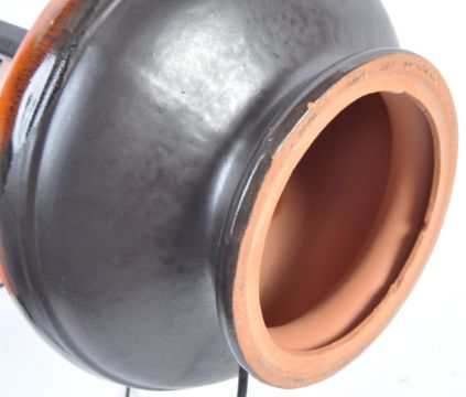 Walter Gerhard - W. German - A 20th Century retro vintage studio art pottery terracotta lamp base having twin handles ribbed column and bulbous body in a black orange and green colourway. Measures; 46cm tall.