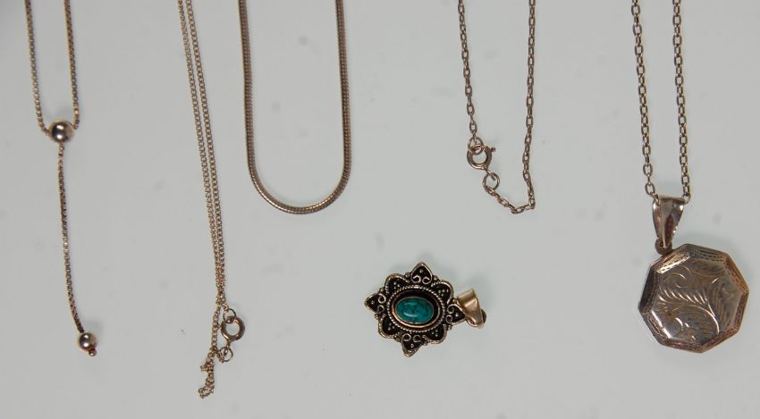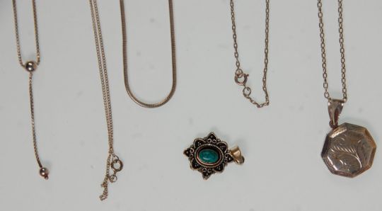 A mixed group of ladies silver necklace chains and pendants to include box link and snake chain examples, Art Nouveau style pendant set with a blue stone, engraved locket, heart pendant set with white stones etc. Gross weight 50.09g.