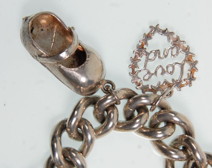 A thick link silver chain charm bracelet adorned with charms to include three textuard rings, crown, baby's shoe, 21st key etc. The chain having a heart clasp English hallmarked for Birmingham. Total weight 75.6g. Measures 6 inches long.