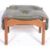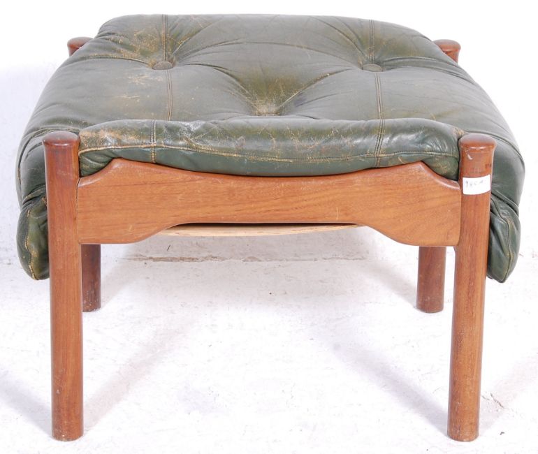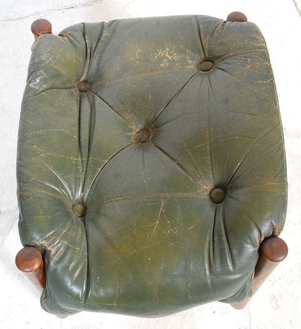 A vintage retro mid 20th Century teak wood framed ottoman footstool having green leather buttoned upholstery and raised on turned legs.