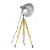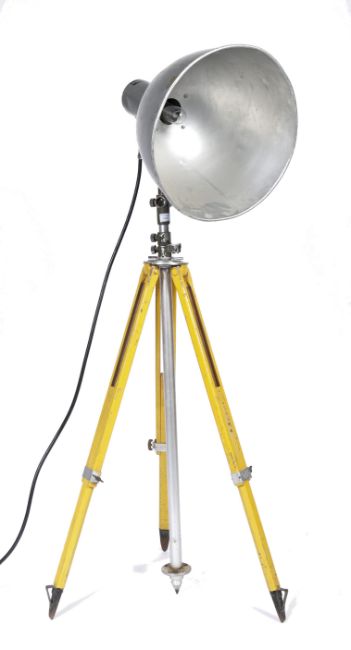 Mole Richardson - An original 20th Century retro vintage industrial film studio set theatre spot light lamp having a bell shaped shade with cylindrical bulb holder. Makers marks and numbers 18TV4 to verso. Raised on an associated yellow painted tripod. Originally taken from University of Bristol AVA Unit. Measures: 146cm tall.