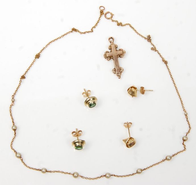 A 19th century Victorian 9ct gold necklace with seed pearl beads together with a pair of 14ct gold stud earrings set with green stones, a pair of 9ct gold knot design stud earrings and a 9ct gold crucifix pendant. Total weight 4.9g. necklace measures 14 inches.
