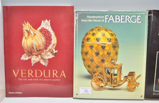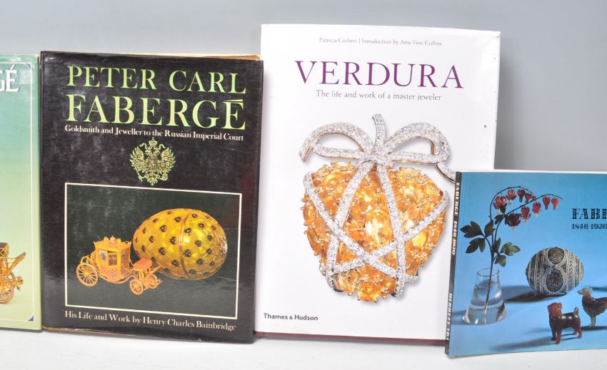 Five Verdura and Faberge jewellery reference books; Verdura, The life and work of a master jeweler by Patricia Corbett (Thames and Hudson 2008), Verdura, The life and work of a master jeweler by Patricia Corbett (Thames and Hudson 2002), Peter Carl Faberge: Goldsmith and Jeweller to The Russian Imperial Court, His Life and Work by Henry Charles Bainbridge (Crescent Books 1979), Masterpieces from the House of Faberge by Alexander von Solodkoff (H.N. Abrams 1984), Faberge Goldsmith to the Imperial Court of Russia 1846-1920, exhibition catalogue from the V& A 1977.