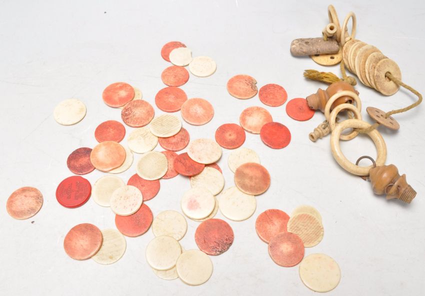 A collection of 19th Century antique bone gaming tokens, some being coloured red together with a selection of turned bone tokens including on marked Duval Restaurant.
