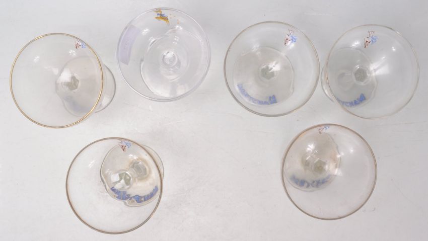A group of six vintage retro Baby Cham glasses having printed Fawn logos and lettering to the bases.