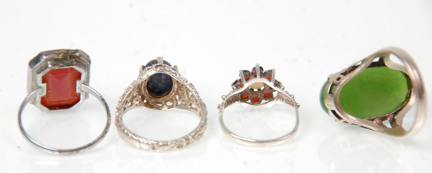 A group of seven silver rings to include a green stone panel ring (possibly jade) a lapis lazuli set ring, three art deco rings set with red stone panels, a green stone ring and an opal ring with a halo of red stones. Weight 23.7g.