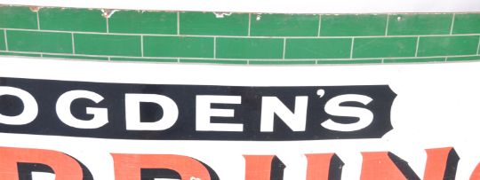 Ogden's - St Bruno Flake - A huge early 20th Century antique vintage tobacco point of sale advertising porcelain enamel sign having a shaped white sign on green brickwork background. The inner white sign reading ' Ogdens's, St Bruno Flake, The Standard Dark '. Measures; 100cm x 297cm.