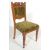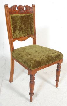 A group of four late 19th century mahogan Art Nouveau mahogany dining chairs having solid frames with carved scrolled decoration back rests with green velvet upholstery raised on turned tapering legs. H90 W50 D48cm
