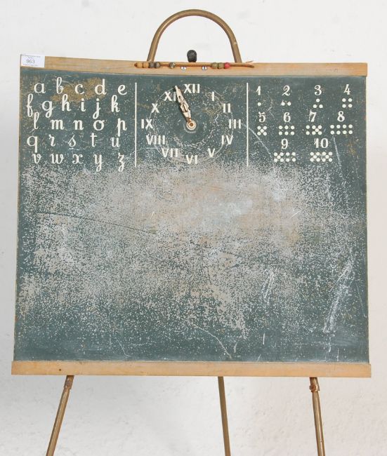 A vintage retro 1950's school black board having alphabet letters, a clock with moveable hand and numbers to the top of the board having a handle to top on tripod legs.