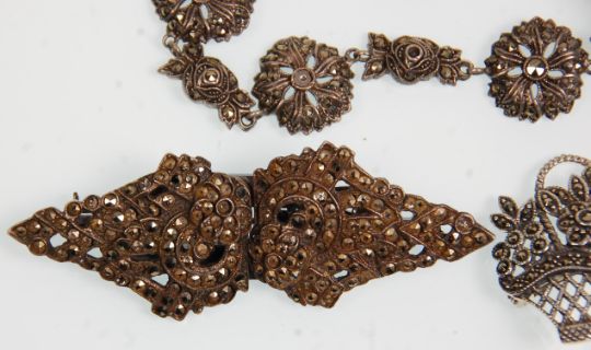 A group of five pieces of silver and marcasite ladies jewellery to include brooches and a decorative floral bracelet, basket of flowers brooch etc. Gross weight 56g.