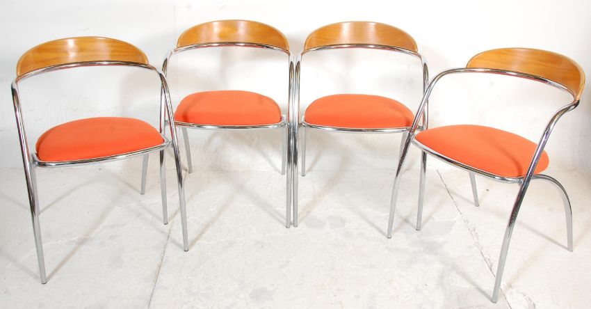 A set of four vintage retro Italian dining chairs having crossover design chrome tubular frames with wooden back rests and orange upholstered seat pads. Measures 75cm x 54cm x 56cm.
