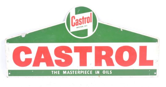 Castrol - an original retro vintage enamel type double sided advertising sign for Castrol oil. Squared base, with apex top, with notation in red and white to both sides. Mounting holes to corners. Wonderful piece of garage advertising. Measures: 23cm x 48cm.