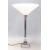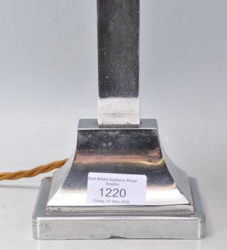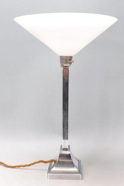 A good vintage 20th Century Art Deco chrome table lamp raised on a stepped base having a white glass shade atop. Measures 39cm tall.