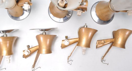 A set of vintage retro gilt wall mounting lights each having a textured gilt finish with conical frosted glass shades.