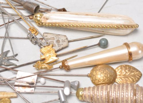 A collection of vintage hat pins dating from the early 20th Century to include a gilt eagle hat pin, an engraved 1925 pin, pins set with stones and pins with metal finials.