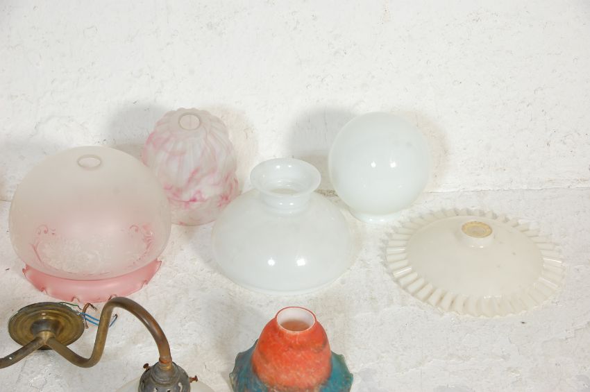 A good group of vintage glass shades dating from the early 20th Century to include Art Deco examples with a white swirl shade and white glass ball shade, retro coloured shades, table lamp, brass wall light fitting and white glass shades etc. One plastic example.