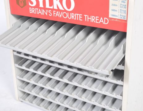 Sylko - A late 20th Century retro vintage counter top haberdashery cotton reel cabinet having seven sectioned trays and branding to the top of the cabinet. Measures; 50cm x 50cm x 38cm.