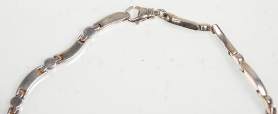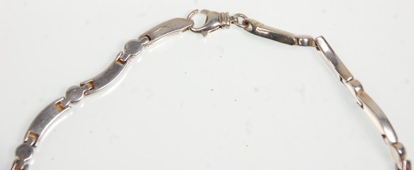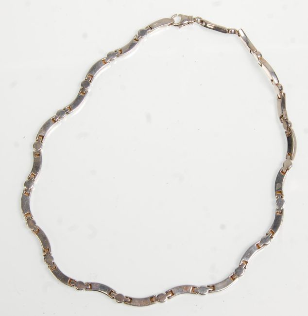 Two silver necklaces to include a curved link necklace joint together by rounded joints having a lobster clasp bearing London marks. Measures 17 inches long. Together with a flat link chain necklace. Measures 20 inches long. Total weight 117g.