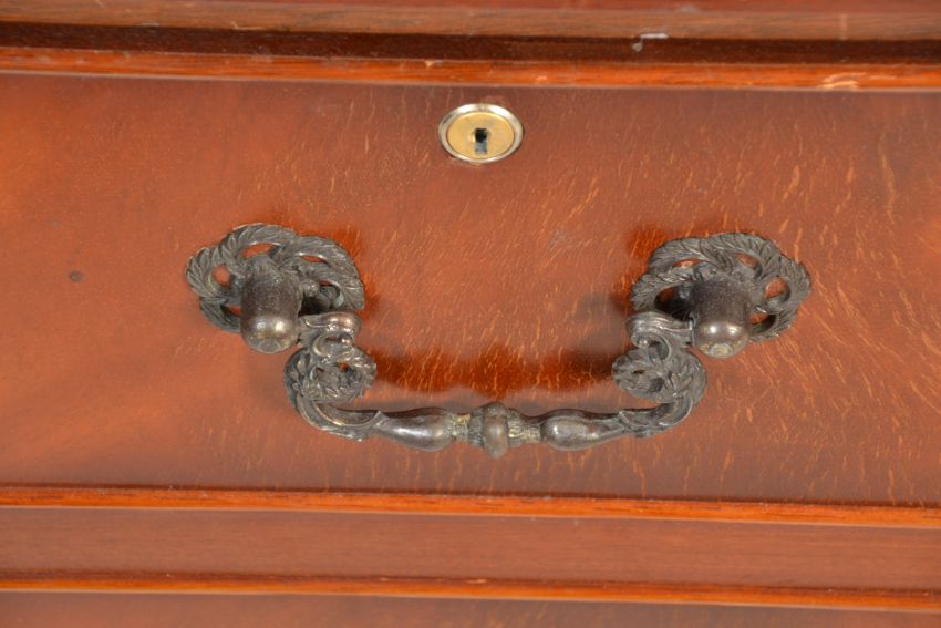 An antique style mahogany and leather office filing cabinet. Raised on a plinth base with twin drawers having filing rails set within. Finished with a green leather top above. Together with a small mahogany side table on castors. Measures 77 cm high  x  47 cm wide  x  62 cm deep.