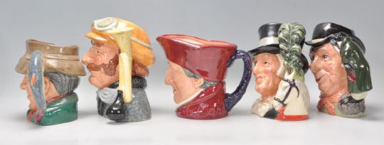 A group of five Royal Doulton character jugs to include The Poacher D6429, The Walrus and Carpenter D6600, The Ring Master D 6863, Veteran Motorist D6633, and one in the form of a cardinal.
