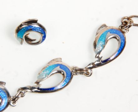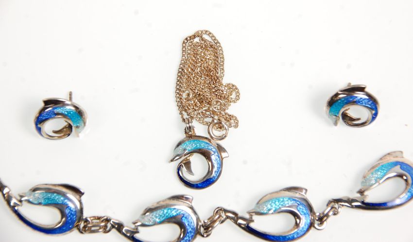 A silver hallmarked and enamelled demi-parure necklace, bracelet and earrings set in the the form of dolphins with varying shades of blue enamel detailing. Total weight  27.3g. Bracelet measures 7.5 inches long.