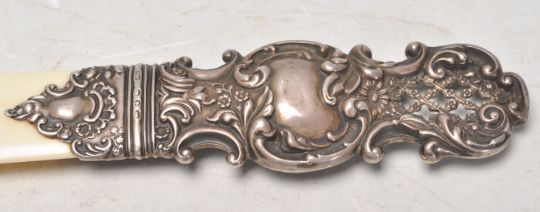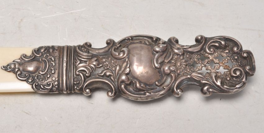 A lovely early 20th Century ivory page turner having a decorative silver handle with scroll and floral decoration. Hallmarked for London date letter B 1917.