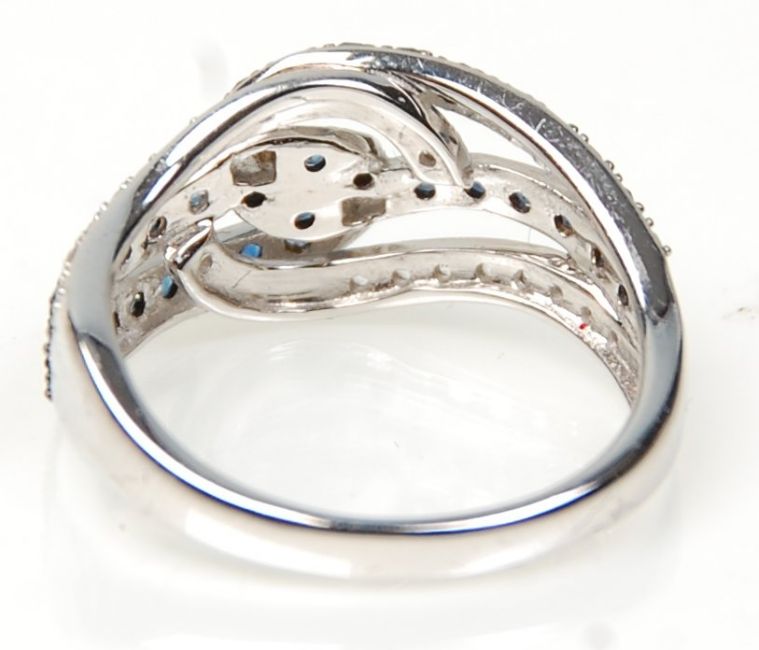 A stamped 14ct white gold knot ring set with diamonds and sapphires. Weight 3.8g. Size L.