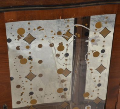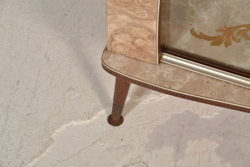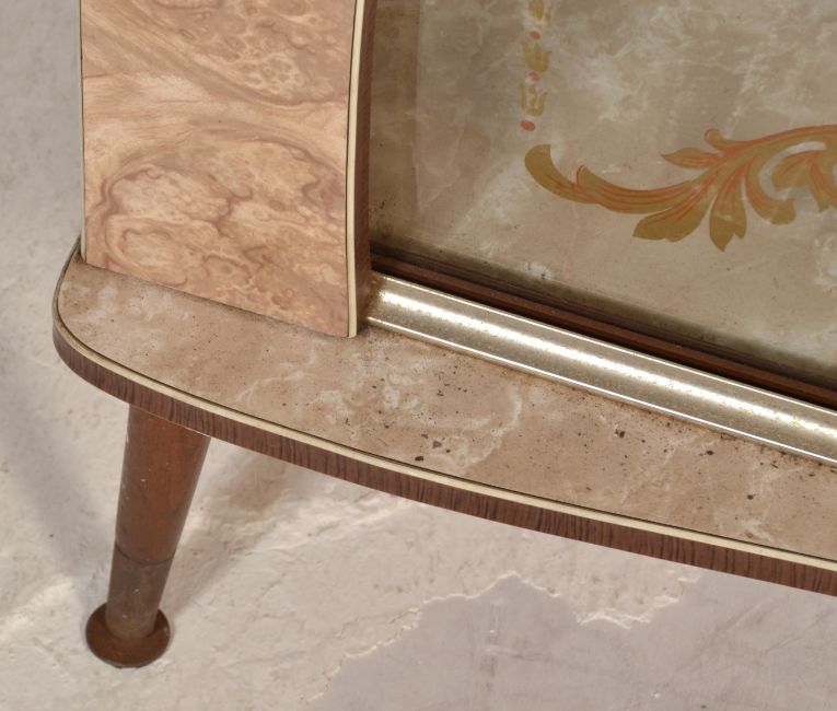 A 1930's Art Deco display cabinet with mirror back and unusual gallery top above all raised on tapering legs together with a mid century formica 1950's example with sliding glass doors. Measures 119 cm x 103 cm x 30 cm.