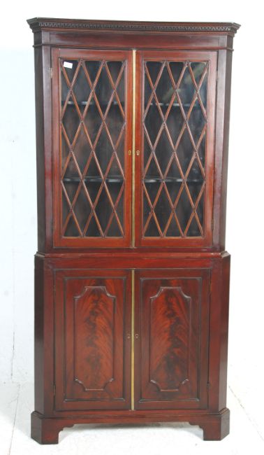 A 19th Century mahogany corner cabinet having a twin door cupboard base with carved panelled doors, having an astral glazed twin door cabinet to the .H198 W96 D40cm