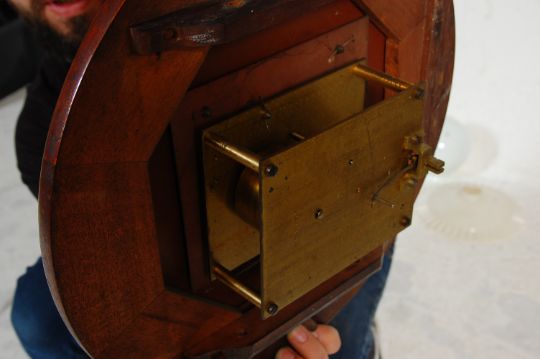 A late 19th / early 20th Century mahogany cased station wall clock having a round face with roman numerals to the chapter ring. Face marked for Kemp Bros Union St. Bristol. Brass eight day movement.