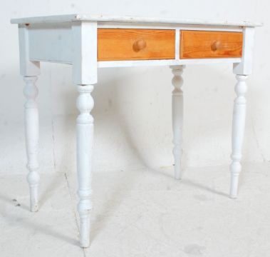 A 19th Century Victorian shabby chic painted pine writing table desk raised on turned legs with twin drawers to the frieze. H80 W90 D50cm